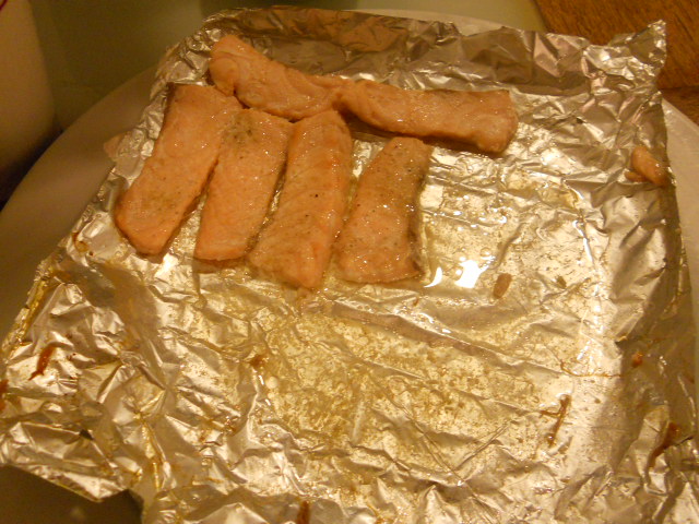 唯一食べられたサーモンのマスタード焼き エビの刺身と良く解らない付け合せ