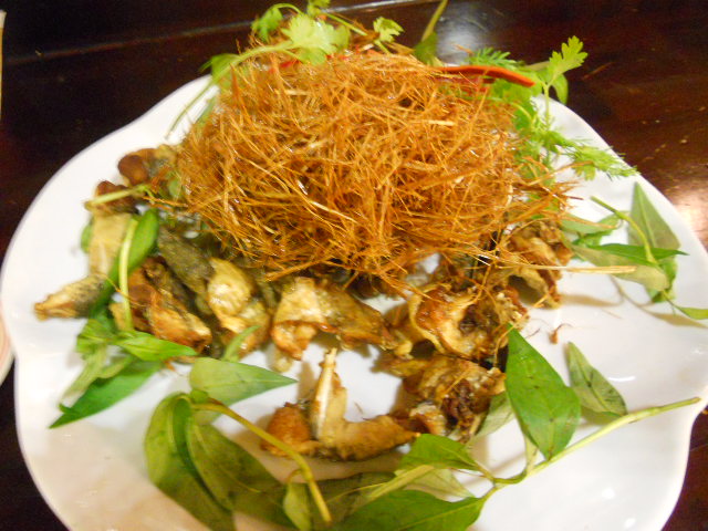 カエルのから揚げ、鳥の巣に見えるのはレモングラスの素揚げ