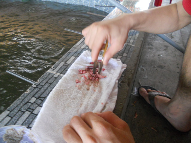 こいつを手際よくハサミでチョキチョキ!針につけるのがキツイなぁ〜!