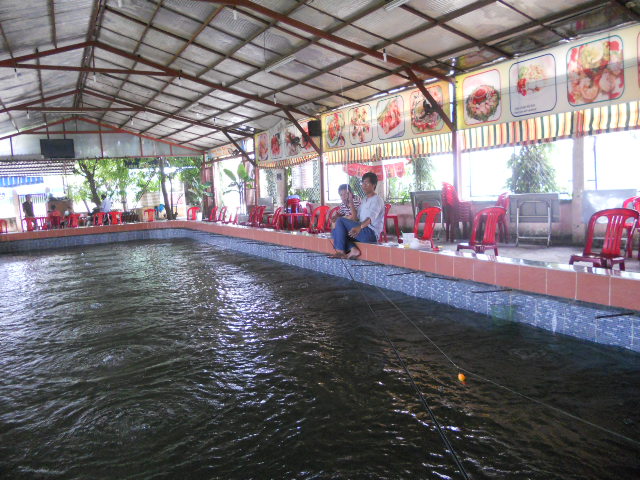 日本にも昔よくあったどデカイ室内釣り堀!! レストランも兼用で、その場で焼いてくれます!