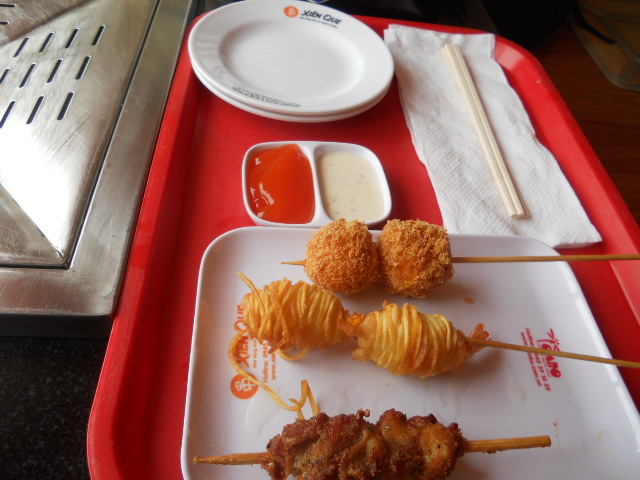 串揚げ屋でした。入口に並ぶ冷蔵ケースから自分で選び、レジで精算(10,00〜15,000vnd)¥40