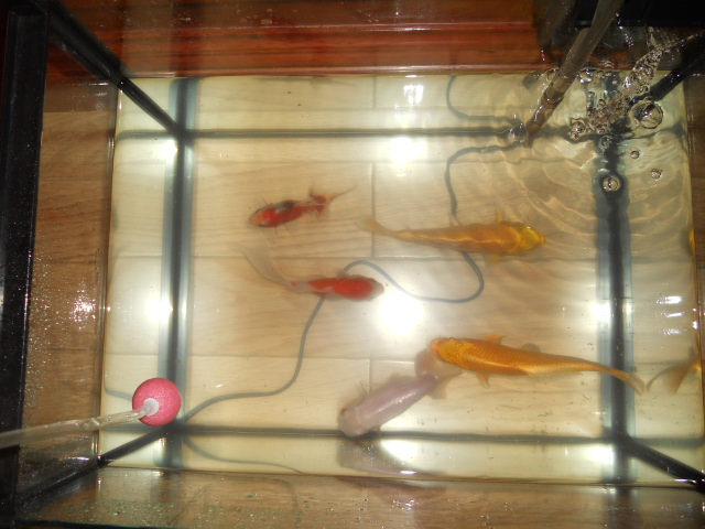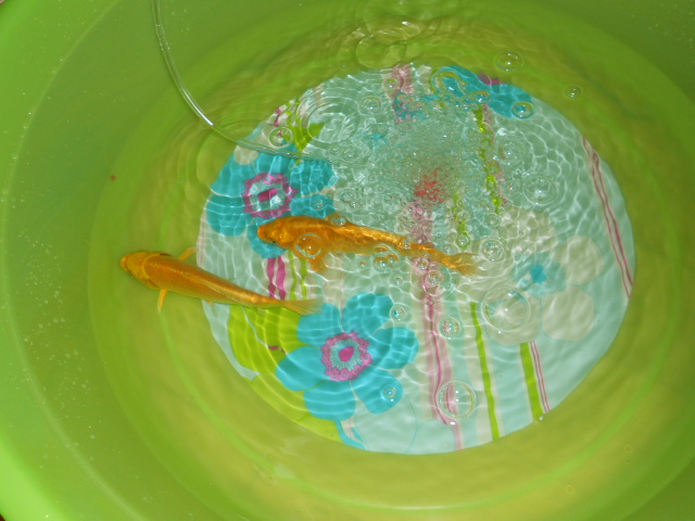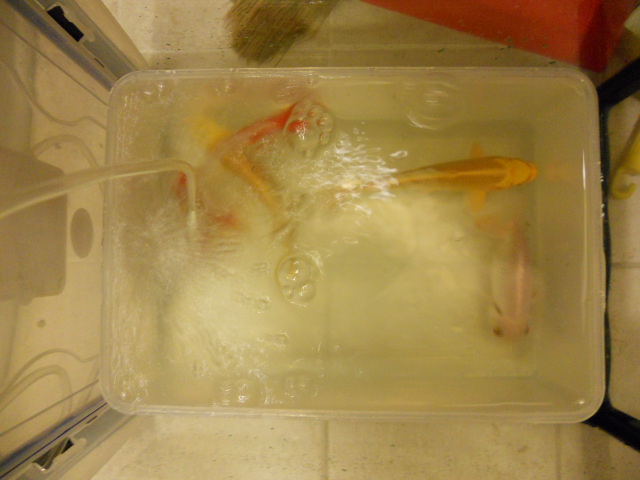 魚の水合わせ は意外と難しくないようだ。鯉が動きまくって金魚クン達に迷惑なので分けた。