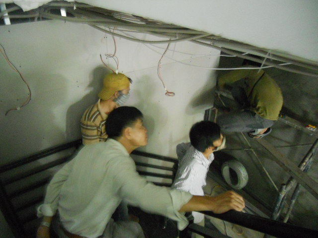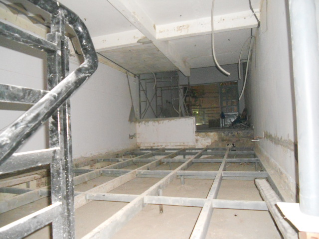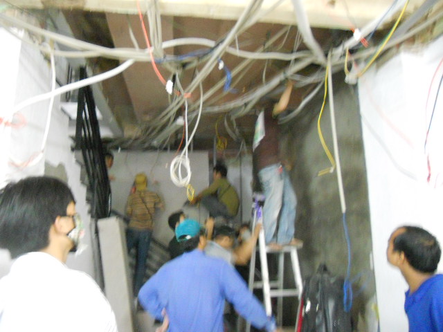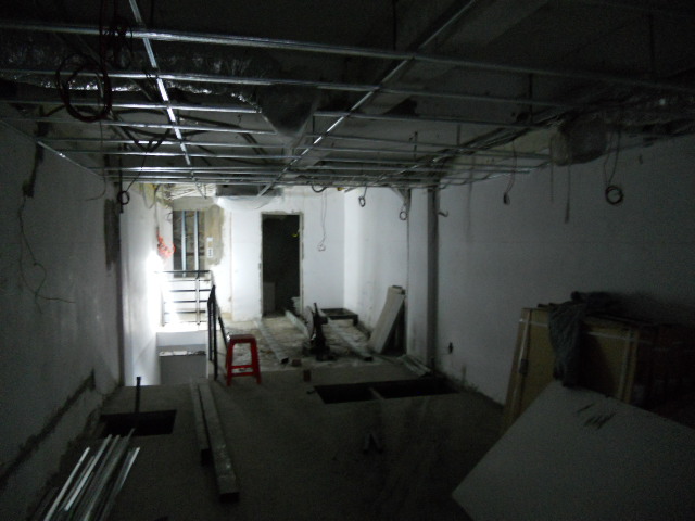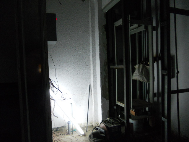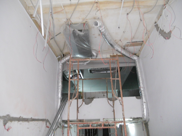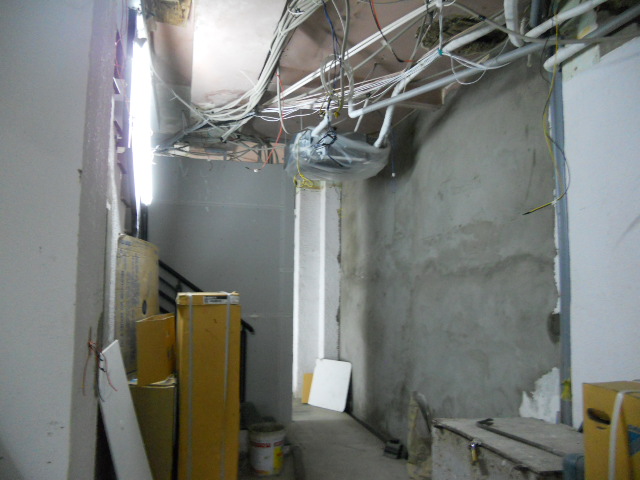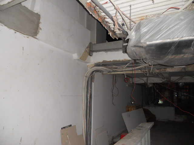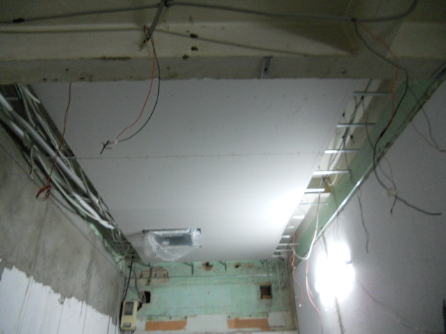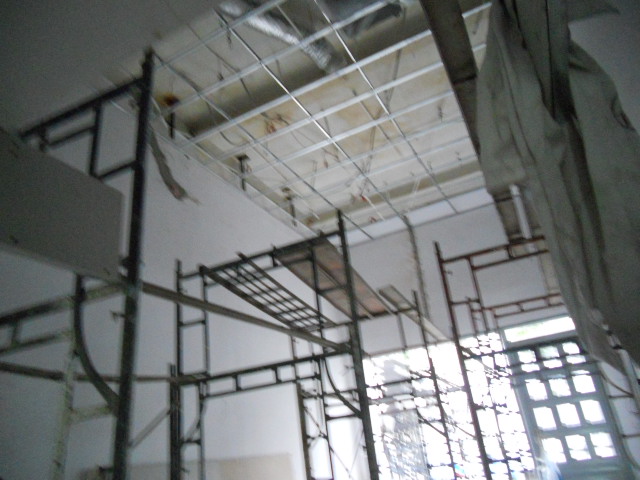 本日、工事の様子。天井に工事が始まった。相変わらず階段が取り外されていて上へ行けない。