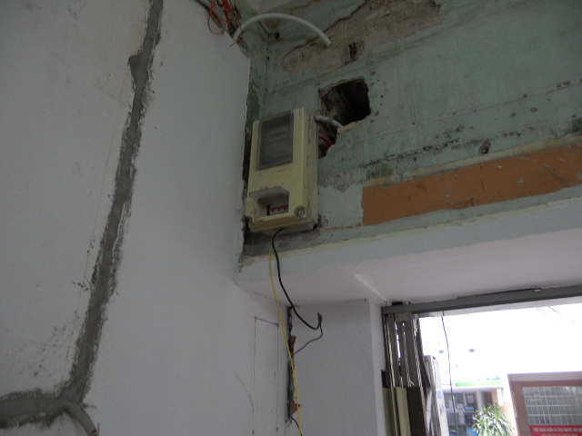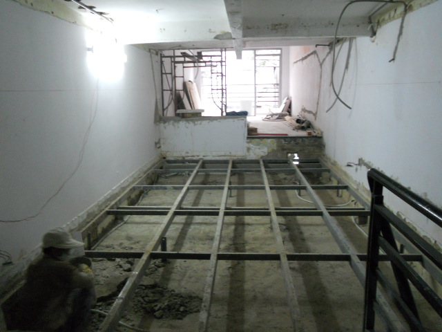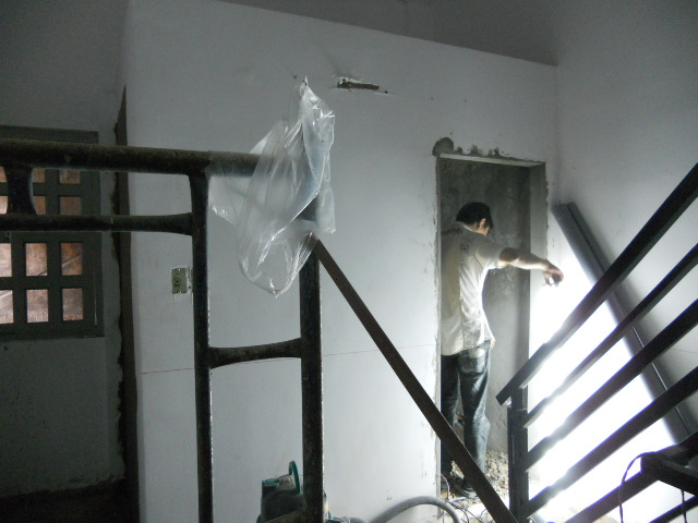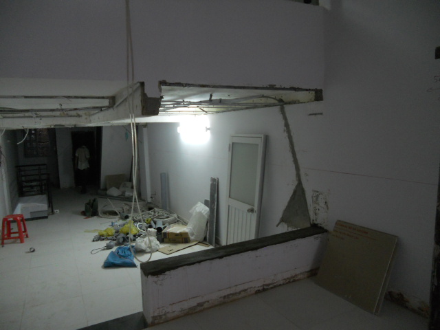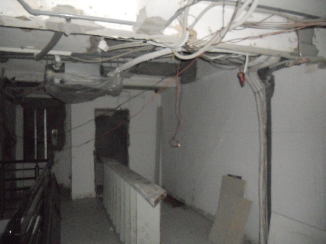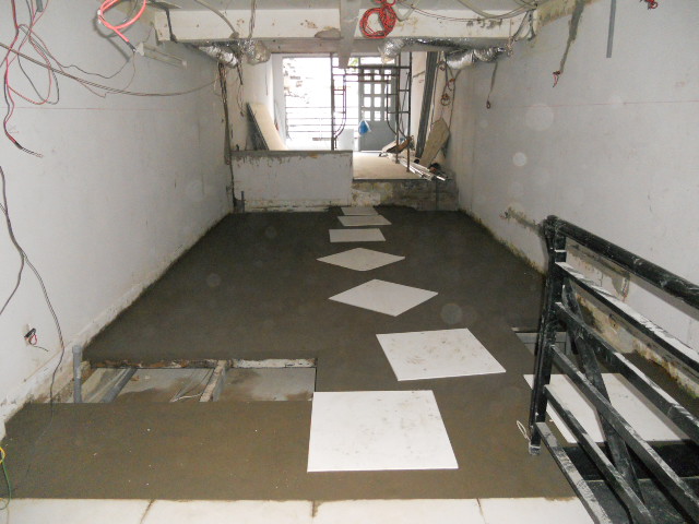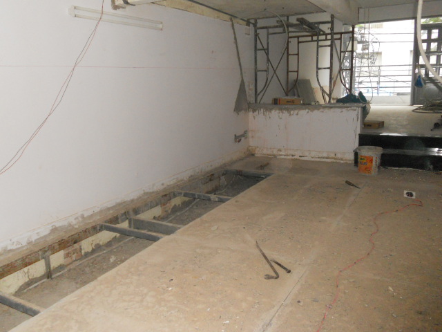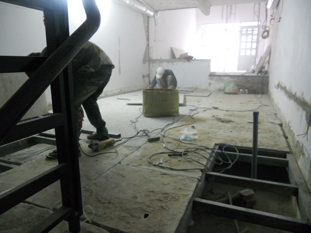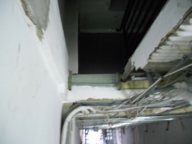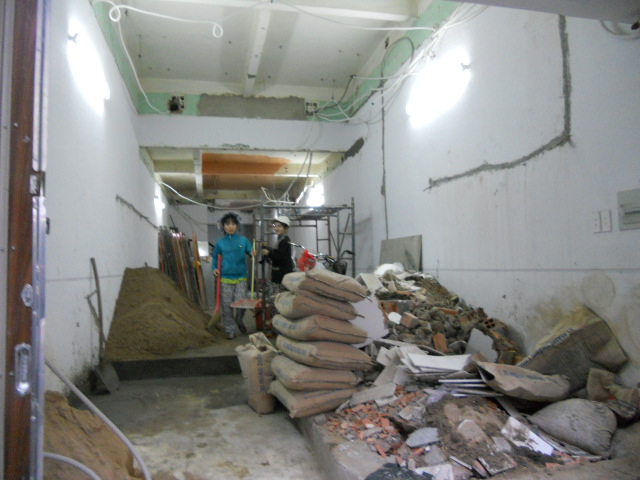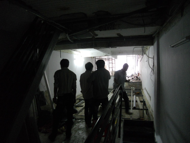 本日、工事の様子。天井に工事が始まった。相変わらず階段が取り外されていて上へ行けない。