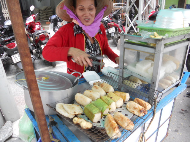 店の前で売ってる屋台のおばちゃん。バナナもち・パン・バナナ寒天にタピオカジュースかける