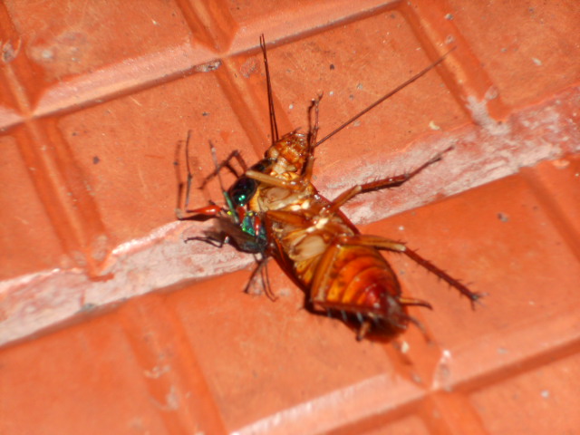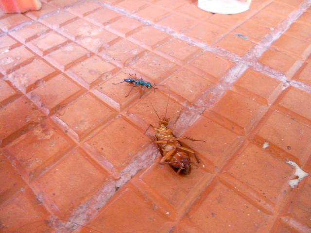 近所のレストランでゴキブリをストーカーして襲い掛かる ジバチ みたいなものを見た。卵を産み付けている???