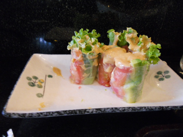 サーモンといくらの生春巻き。サケの切り身・アボガド・レタス・きゅうり・玉ねぎだけで、