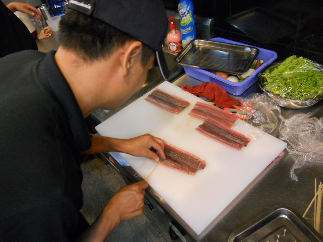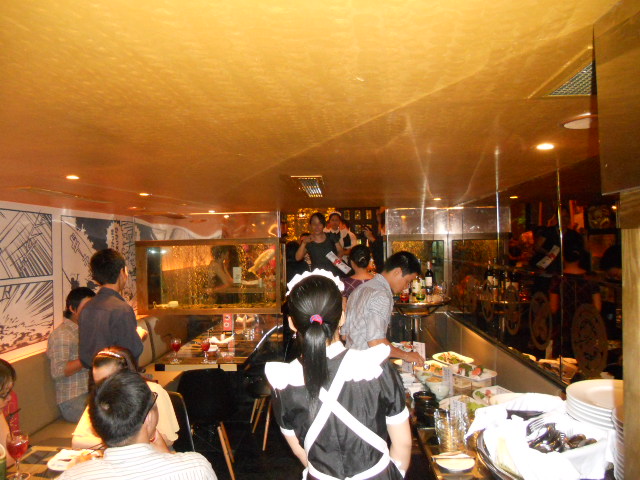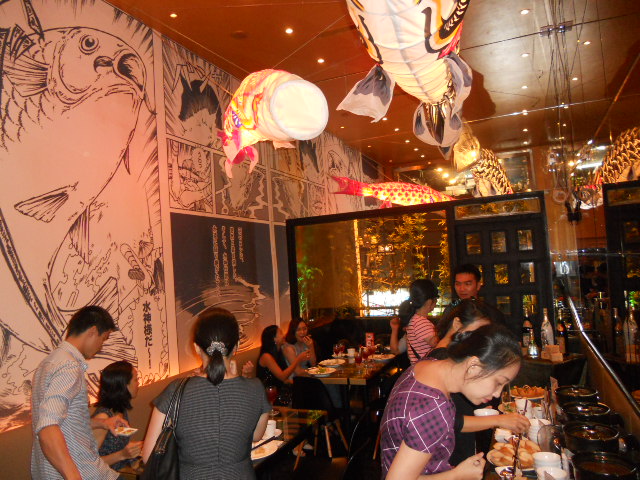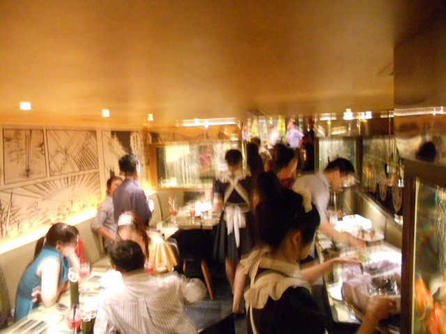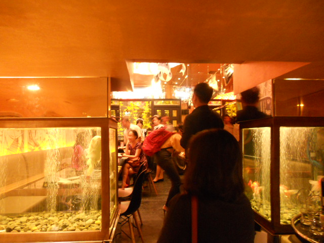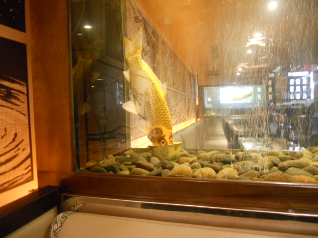 店中からの様子。投獄ではない! 行儀よく食べている鯉君! クチャクチャ言わないだけましだ!