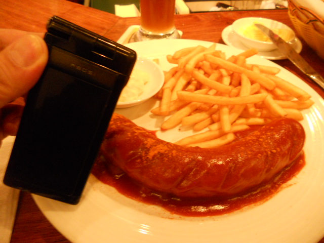 デッカイ カレーソーセージ。どこがカレーかわからない。カレーに対する基本的な考えが違うのかもしれない。