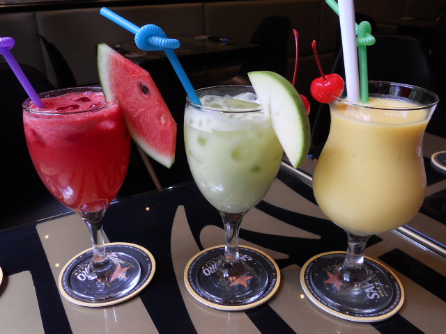 また、指摘された マズイジュース を改革! 左からスイカ・マンゴ−ジュ−ス・マンゴスムージ